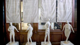 Cuatro maniquíes con jorobas, curvos y voluptuosos posan en el hall de entrada del Museo de la Historia del Traje como parte del trabajo "Cuerpos defectuosos. Soberanía de la indumentaria" de la artista Victoria Azcona, quien toma como punto de partida el libro "Método de corte Sistema Mendía" (1952) para sacar del anonimato a aquellos cuerpos considerados anormales dentro de los estándares estéticos hegemónicos y convertirlos en arte textil.   En esta exposición/instalación, la artista visual, vestuarista y docente argentina Victoria Azcona trabaja sobre la problemática de los cuerpos que se encuentran por fuera de los parámetros de talles establecidos por la industria de la indumentaria, cuerpos a los que socialmente se considera defectuosos y a los que se los excluye de la industria.   Para el desarrollo de la exposición, partió del libro "Método de corte Sistema Mendía", en su 36.ª edición, de 1952, un manual destinado a mujeres amas de casa, que traía moldes para confeccionar indumentaria de modo artesanal. En aquella época, el cuerpo considerado hegemónico implicaba una cintura "de avispa", "muy chiquita y muy marcada", cuenta Azcona. "La cintura icono de la moda de los '50 es Evita, ese ideal que tenemos de ella con sus vestidos a la cintura o esos trajecitos que usaba eso es un poco digamos el ideal de belleza de esa época", ejemplif ica.