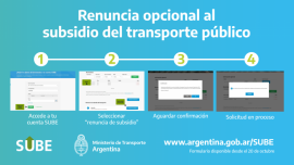 El ministro de Transporte, Diego Giuliano, anunció este lunes que los y las pasajeras podrán renunciar a los subsidios aplicados en las tarifas de transporte público y abonar la tarifa plena, permitiendo que esos subsidios sean derivados a los sectores de mayores necesidades.   La alternativa, anunciada por el funcionario nacional en una conferencia de prensa realizada en el edificio del Ministerio de Economía, estará disponible para usuarios de colectivos y trenes de jurisdicción nacional y se podrá gestionar desde el 20 de octubre a través de la web argentina.gob.ar/SUBE.   De acuerdo a lo manifestado por Giuliano, la medida busca “lograr una redistribución del ingreso a favor de los sectores de la población que se encuentran en una situación de mayor vulnerabilidad” y entrará en vigencia desde el 27 de octubre.   En el caso de los colectivos, y hasta que los datos de la renuncia sean procesados, también se podrá solicitar al chofer abonar la tarifa plena.